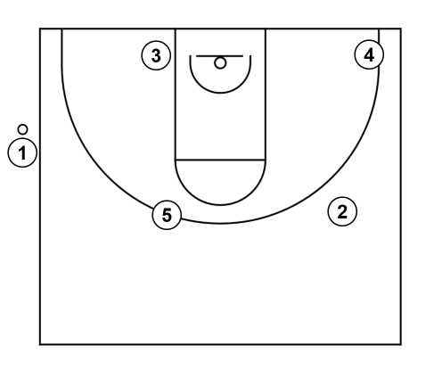 Banda para finales de posesión para buscar un tiro en pocos segundos. Sacamos con el base. Nuestro mejor tirador lo colocamos en poste bajo de lado de balón y nuestro segundo mejor tirador en el alero de lado contrario al balón.