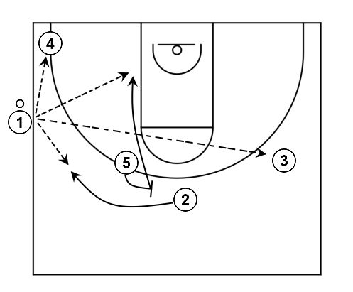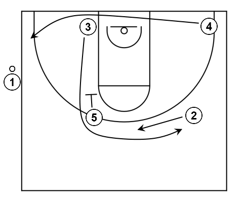 Jugamos bloqueo indirecto de 5 para 3, que busca la posición de alero de lado contrario para pase bombeado al lado contrario. En el camino se cruza con 2, nuestro segundo mejor tirador. 4 ocupa el espacio de 3 para buscar bajo aro o llegar a la esquina para recibir y tirar.