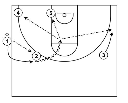 Si no conseguimos ninguna de estas ventajas, 1 saca sobre 2 y va a mano a mano para atacar el centro de la zona. 5 continúa la penetración por la línea de fondo y los otros tres jugadores abren línea de pase como tiradores.