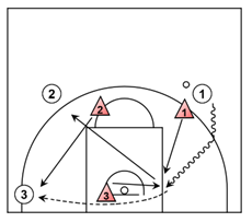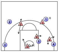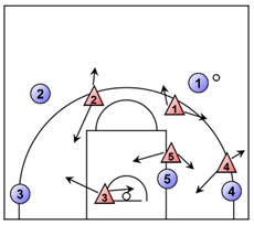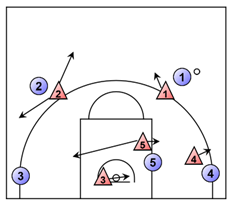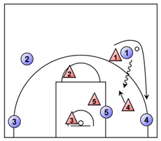 Defensa individual “1”: Defensa al balón controlando el 1er bote de penetración y orientando hacia fondo. Queremos dificultar las primeras líneas de pase. Los bloqueos indirectos los defendemos en persigue, directos en flash y mano a mano de 4º jugador. Todos los rebloqueos o bloqueos directos tras mano a mano los defendemos en cambio automático.