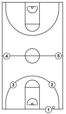 Saca siempre nuestro 1 y el resto nos colocamos en caja, con nuestros teóricos 4 y 5 en las esquinas de medio campo y los otros dos jugadores en prolongación de tiro libre.