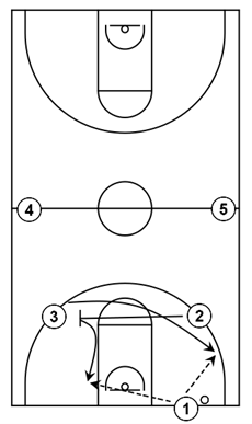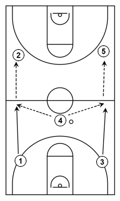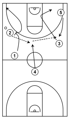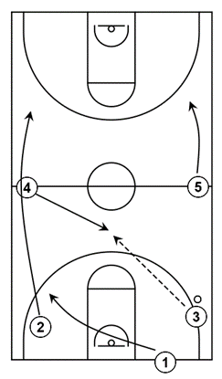 En cuanto llega balón a la posición de alero jugador finta de bloqueo directo y estamos en transición. Invertimos el balón con poste repetidor tras corte y aparición en lado contrario y seguimos con la transición ofensiva.