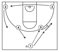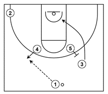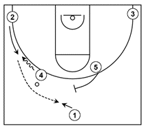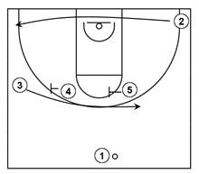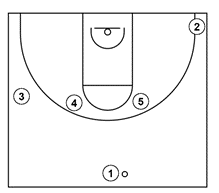 (4) Si no hay ventaja entre 3 y 5 4 juega mano a mano + bloqueo directo con el exterior de su lado. Si no hay ventaja triangulamos con 1 y estamos en Lithuania Motion con el directo hacia la esquina.