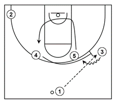 (3) Como primera opción intentamos jugar el pase con el primer bloqueador para que cuando reciba juguemos el bloqueo ciego entre 3 y 5 para intentar una canasta fácil cerca de aro o tiro exterior de 5.