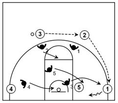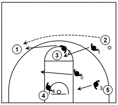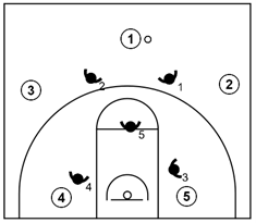 (3) El poste alto se defiende con los dos jugadores de arriba de la caja siempre que el balón esté fuera de cabecera que cambiará con la inversión de balón.