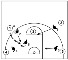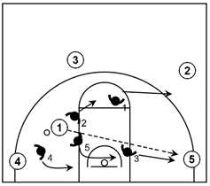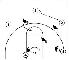 (2) Si el balón va a un alero, lo cogemos por el defensor más cercano de la caja en individual y 5 se coloca en línea con balón. Los otros dos jugadores mantenemos la caja en lado contrario a modo de doble penúltimo.